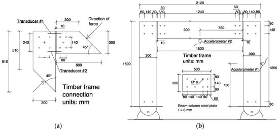 Two experiments were performed in the laboratory at the University of Bath: a static test on a typical steel-timber connection with 4 + 4 dowels (Figure 2a) and a non-destructive vibration test on a symmetric portal frame 1500 mm × 1500 mm (Figure 2b). The joint was cut off from the frame once the vibration test had been performed.