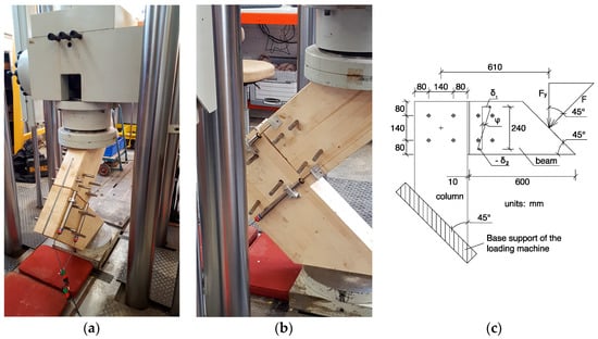 Each member has cross section of 140 mm × 300 mm (Figure 2b) and the material is whitewood glulam of grade GL-24h, as defined in EN 1408 []. The steel plate slotted in the timber elements links two different connections: a four-dowel connection on the column and a four-dowel connection on the beam. The steel grade is S235, with 8 mm-thick plates and 16 mm diameter holes accommodating the steel dowels. 16 mm diameter holes have been drilled into the timber members. The fasteners are of S235 grade and have a diameter of so to fit tight into the holes. Beams and columns were cut with an angle of 45° and the specimen was vertically loaded so to induce a bending moment in the joint (Figure 3a,b). The connection was statically loaded through Instron 2000 kN Universal Testing Machine in displacement-control (). Two transducers fixed at the column measured the relative column-beam displacement of the joint in two points spanned 140 mm, placed symmetrically to the beam axes (Figure 2a). The corresponding angular deformation can be easily found through the following equation: