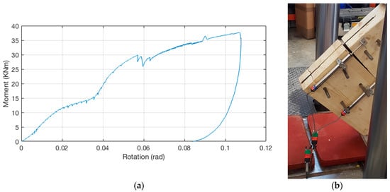 The approximate stiffness value is later used to validate the numerical model in Section 4. A ‘sawtooth’ path is visible since the first stages of loading path. This is supposed to be caused by invisible cracks that are occurring inside the connection since low load. When the load increases (about 11 kNm), the stiffness dramatically decreases and a softening behaviour is observed in the load-displacement curve. Once the moment attains a value of 15 kNm, a steep increasing of the stiffness can be seen. This atypical behaviour is because of the contact that occurred between member surfaces at bottom-side (Figure 3b). The center of rotation of both connections shifts resulting in different angles to the grain. Another non-linear path can be shown until the bending moment arrives to about 30 kNm. Here, cracking strongly occurs in part of the wood matrix that reaches the compression strength and plastic deformations. The stiffness sensitively decreases until the maximum load is attained (37.68 kNm). A yield plateau is visible at the final stage and a maximum rotation of () is obtained. At the end of the test, final failure occurred, resulting in a sudden load reduction (Figure 4a). Brittle failure is reached because maximum tension forces are attained perpendicular to the grain in the column member.
