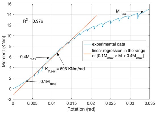 By the analysis of the first three stages of the moment-rotation relationship (Section 2.2), a linearization of the curve allows for calculating the rotational stiffness of the connection. Reynolds [] shows that the range of loads imposed on a connection in service is of 20% and 40% of the predicted characteristic capacity. According to CEN (European Committee for Standardisation) [] the initial stiffness is calculated from 10 to 40% of the peak load. The latter is used in this study to evaluate the rotational stiffness of the joint.
