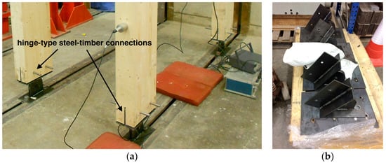 A non-destructive vibration test was carried out to evaluate the dynamic properties (i.e., frequency and modal damping) of the timber portal frame, as shown schematically in Figure 2b. The portal frame is made by two identical frames with four columns and two beams all 1.5 m long. Description of materials, cross sections, and geometry of the joints can be found in Section 2.1. Columns are pinned at the ground through hinge-type steel-timber connections (Figure 7a,b).