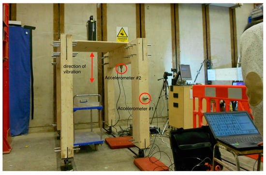 Table 1 summarizes the main characteristics of the performed experiments. The excitation method was a slow sine sweep, in which a sinusoidal force, gradually increasing in frequency, was applied by the shaker and the rate of increase of frequency was sufficiently slow that the steady-state response at each frequency had time to develop. The shaker (APS 113 ELECTRO-SEIS®, APS Dynamics, Inc., San Juan Capistrano, CA, USA) had a mass of and a frequency range from to . Two piezoelectric accelerometers having a lower frequency limit of and a nominal sensitivity of were fixed to the mid-height column (#1, Figure 2b) and at the mid-span of the beam (#2) to read the vertical and horizontal response (Figure 8). The data logger was connected to a laptop and the records were processed with the software LabVIEW (National Instruments, Austin, TX, USA) []. For all of the tests performed, a sampling rate of 500 Hz was used and frequency was manually tuned from 0.1 Hz to 100 Hz to cover a considerable range of frequency spectrum.