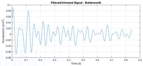 A 9th-order Butterworth filter was chosen to eliminate frequencies outside the interesting range. Figure 10 shows the filtered time history record of one of the trimmed signal ( from test #2 displayed in Figure 11.