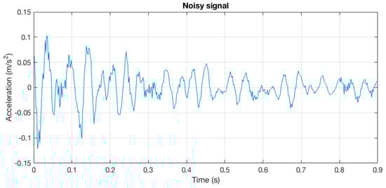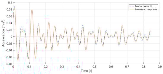 The acceleration time histories data (obtained as illustrated in Section 3.2) are processed in time domain by using the Matrix Pencil Algorithm (MP Algorithm) [] through a specifically developed MATLAB script, where the number of modes contributing to vibration signal has to be assumed. A wrong assumption could lead to misleading results of the damping ratios. The algorithm derives fundamental frequencies and associated damping ratios, and performs a procedure to compare fitted signal to the measured signal visually, as shown in Figure 12. A very good agreement is obtained.