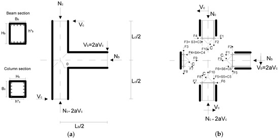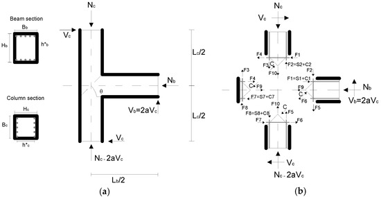 Equations (A1)–(A9), solution of the system, allows us to calculate the evolution of forces in the joint as function of column shear, Vc; hence, it is possible to evaluate directly the values of each Vcs. In particular, looking at the joint failure, column shear corresponding to the yielding failure of bars in tension into the beam or columns can be evaluated by equating F1 (Equation (A1)) to minimum yielding force of beam reinforcement (Equation (A10)); and F2 (Equation (A2)) or F8 (Equation (A8)) to minimum yielding force of (upper or lower) column reinforcement (Equation (A11)), respectively. Equations (A12) and (A13) allow us to evaluate the limits to assess the column shear corresponding to the ultimate failure of bars in tension into the beam or column.