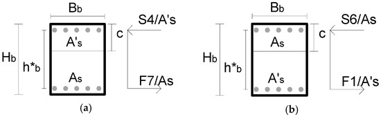 The maximum bond force is provided by the bond strength multiplied by the lateral surface of the bars only for the length inside the rigid portions cut by diagonal cracks in joints. Three conditions of adhesion can be identified, and corresponding bond strength values are , , and (but it is worth noting that bond force could reach values up to six times lower in some cases [30]). In the case of positive shear, at the upper layer of bars, the value of bond force is F1 + S4, while, at the bottom side, the bond force is F7 + S6; in the case of negative shear, at the upper layer of bars, the value of bond force is F4 + S1, while, at the bottom side, the bond force is F6 + S7, where S_s are the steel contributions. The resultant compressive force needs to be split into steel contribution, S_, and concrete contribution, C_ (Figure 3a,b shows S4 and S6 in the case of positive column shear depicted in Figure 1b). In particular, as shown in Figure 1b (for S4 and S6) and Figure 2b (for S1 and S7), there are four steel contributions that can be calculated, for instance, according to Equations (23)–(26).