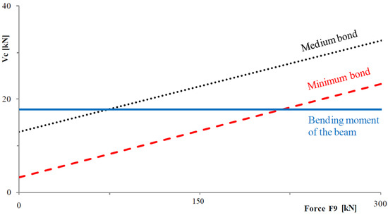 In the case of minimum bond, the failure mode never moves from minimum bond (Vc10 is the smallest ultimate column shear) to other failure modes (apart from adding five stirrups of diameter D8 with two legs, but this is not shown in Table 4). In the case of medium bond, the force that F9 has to provide is equal to 72 kN, reachable by applying two stirrups of diameter D8 with two legs. Figure 4 shows the results obtained for both cases.