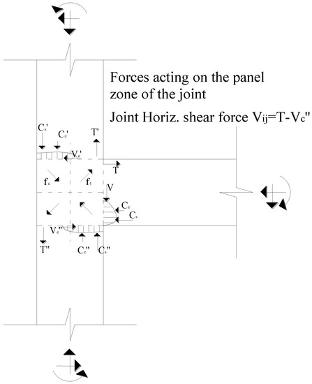 In the case of yielded steel bars, tension forces T are calculated by multiplying the bars’ cross section by the yield stress. Prediction models of joint shear capacity proposed by the ACI 352:2002 [34] and the AIJ:1999 [35] are based on the assumption that the failure of joint occurs in correspondence to the maximum value of joint shear. According to the American code [34], the maximum available joint shear value, Vj,av, is calculated according to the Equation (32):