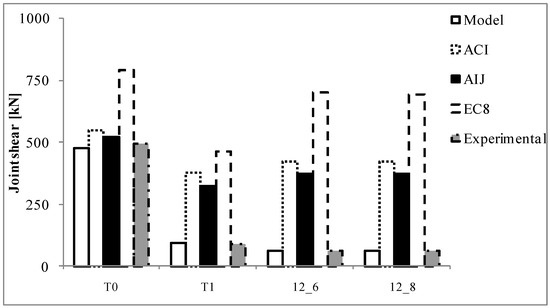 Figure 7 shows the comparison between the joint shear for experimental tests, codes, and the proposed model. The European code [36] presents the higher values of joint shear limit for each considered case, while proposed model presents the lower ones.