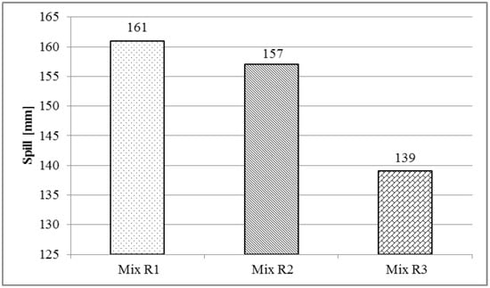 - 50% replacement of mixing water (R3) with waste (sludge) water from a concrete plant results in a spill value lower by 22 mm, i.e., 13.7%, in comparison with the R1 Mix value (comparative).