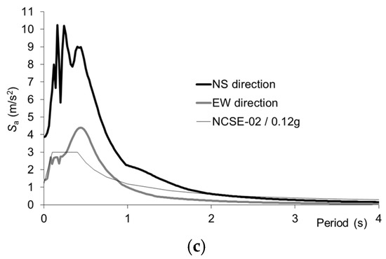 Figure 1c shows a comparison between the response spectra in both directions (North–South and East–West) with a spectrum defined according to the Spanish Earthquake design code NCSE02 for the seismic acceleration of Lorca (ab = 0.12 g) with hard ground. In the figure, Sa is the absolute acceleration. It is immediately clear from the earthquake records that both components of the measured earthquake (especially the North–South) exceed the requirements of NCSE02 for almost all periods of interest.