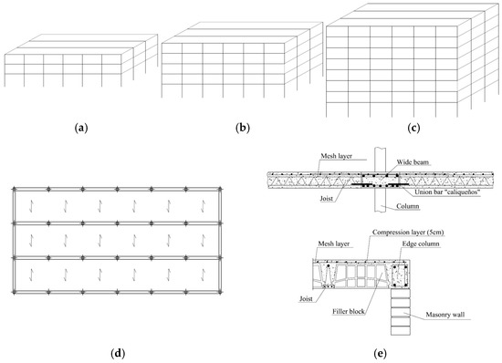 The structures analysed were buildings with one-way slabs and wide beams as this design of building is abundant in many European countries [10]. This type of building is characterised by its capacity for rapid construction and the simplicity of resources required, factors directly related to its relatively low cost of construction. There are other designs available for low-height buildings [27], such as those employing confined masonry instead of reinforced concrete, but these configurations are not common in the regions under consideration (the south-west European countries which are characterised as moderately seismic, e.g., France, Spain and Italy).