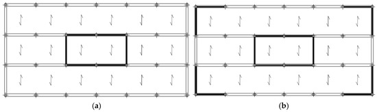 Consequently, only the walls constructed from perforated bricks were assumed to contribute to the structural response of the buildings. In this paper, three scenarios were considered: no infill walls (“without walls”), low density of infill walls (“−walls”) and high density of infill walls (“+ walls”); Figure 3 describes the location of the walls assumed for the latter two scenarios.