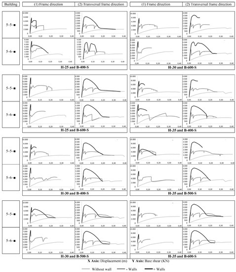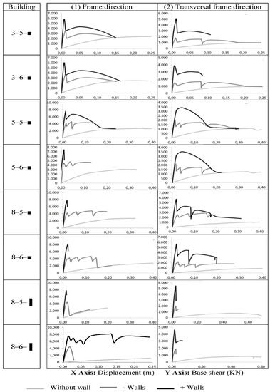 In particular, it is clear that the existence of walls mainly affects the initial parts of the curves, and significantly increases the initial stiffness. This increase is shown in the higher initial slope of the curves and the higher maximum base shear force (ordinate axis) when walls are included. The maximum shear force in the direction of the frames in the buildings “without walls” is approximately twice the maximum base shear force in the transverse direction. This difference reduces as walls are introduced.