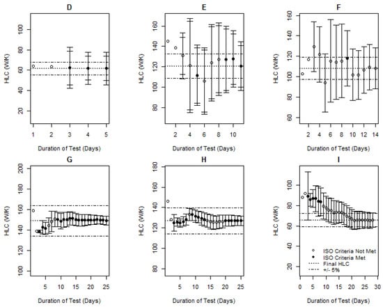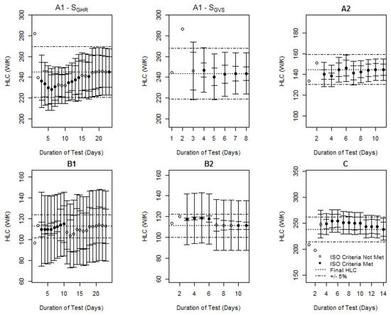 In the majority of cases (12 out of 16), results to within 10% of the final result can be obtained within a 72 h period, subsequently remaining within this bound for their duration. In fact, in 9 of 16 cases this was achieved in just 48 h. Of the cases that do not converge within a 72 hour period, significant uncertainties can potentially be cited, namely the use of either a horizontal solar measurement (A1 (SGHR), B1, F, J1, J4) or unguarded adjoining spaces (B1, B2, I). Specific examples of these uncertainties are discussed in detail in Section 3.5. If these cases are excluded, HTC estimate to within 5% of the full period can be achieved within just 72 h for all remaining cases.