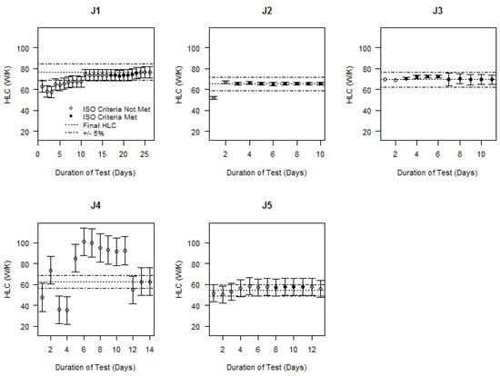 In total, the data from 8 primary and 8 secondary co-heating tests have been evaluated. Specifically, the evolution of HTC estimates is assessed on a day-by-day basis and assessed in respect of the estimated HTC after the full monitored period (Figure 1, Figure 2 and Figure 3). This sample represents modern dwellings tested as part of recent building performance evaluation projects, with a range in dwelling type, construction and form. Summary details are provided in Table 1, although the test dwellings remain anonymised. Some cases represent repeated tests upon the same dwelling (e.g., A1, A2). Case J reports results from a field trial, involving a number of organisations testing the same dwelling [,], including one test conducted by the authors. Field tests have followed the method described in Section 2.1 in more detail, with multiple linear regression used throughout.