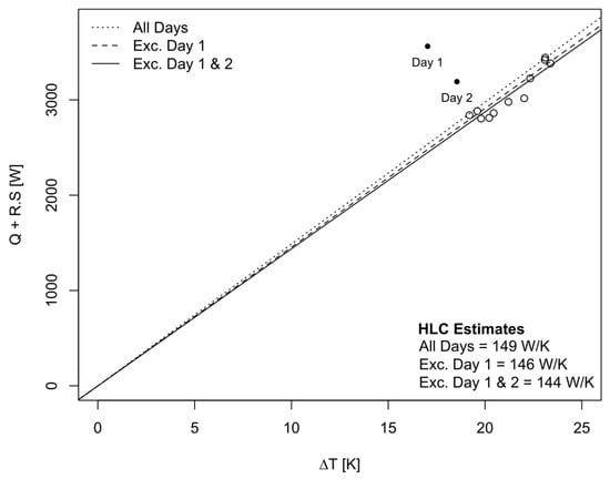 Co-heating is a quasi-steady state, linear regression energy balance based method in which a simplified energy balance is used infer the building heat transfer coefficient (HTC), (Equations (1)–(3)). This provides a measurement of the HTC, or heat loss coefficient, as defined in ISO 13790:2008 [] and national calculation methodologies, e.g., SAP 2012 []. In an unoccupied dwelling, electric heating is used to provide constant and uniform internal temperatures. This allows the adoption of a single zone model, reduces dynamic behaviour due to internal temperature variations and allows the electrical heat input (Qelec) to be measured accurately through metering devices. To further limit the impact of dynamic behaviour, tests are performed over several days or weeks with data aggregated into 24 hour periods. The HTC (H) is calculated through linear regression analysis performed on the daily aggregated data, either through multiple linear regression, with Qelec as the dependent and the internal (Ti) external (Te) temperature gradient, ΔT, and incident solar radiation, S, as the independent variables. Alternatively, results can be analysed through ‘Siviour’ bi-axial regression (Equation (4)), giving: