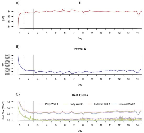 To warm up a house sufficiently to a quasi-steady state can take as little as 1 day [], but can take significantly longer (e.g., 1 week []), depending upon the initial Ti, the HTC and thermal mass of the test dwelling, the external environmental conditions and the installed heating power. For tests considered within this paper, this ranges between 1–5 days (Table 2). The warm up period can therefore represent a longer period than that required to reach convergence and should be considered a significant component of a test. Notably, the warm up period can be reduced if the dwelling has been pre-heated by the existing heating system prior to testing.