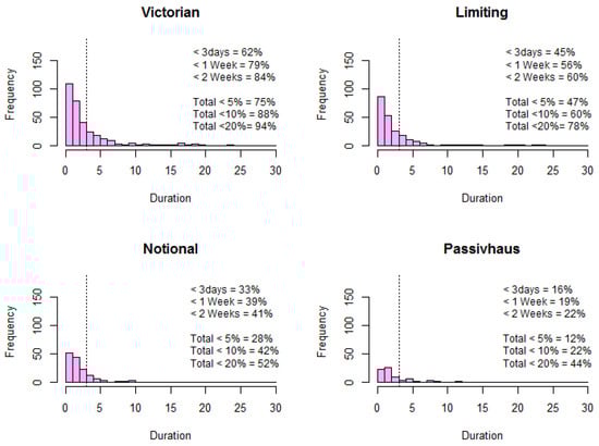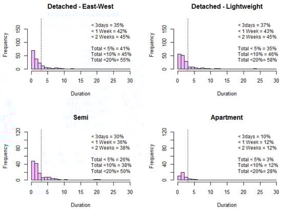 To support and expand on the analysis of field test data, a series of simulated co-heating tests have been performed. Similar checks are made upon the time taken for results to converge to within 10%, of Htrue (Equation (5)). The time taken to achieve this level of accuracy is demonstrated for a number of dwelling types in the histograms in Figure 7. These figures show the results of simulations across a full year, with a new test period starting each day and running until a result is obtained to within the required accuracy of Htrue. These durations are then plotted and listed within each figure.
