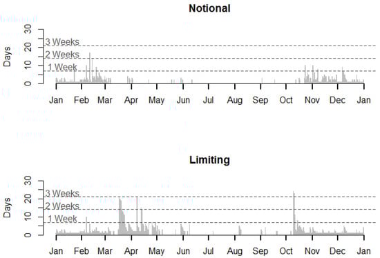 Required test duration across simulated weather file for limiting and notional dwellings. Gaps in the data indicate periods in which a result to within 10% of true value was never achieved.