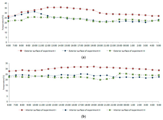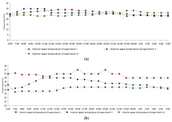 During the data measurement, ambient temperatures were lower and humidity of the air higher with significantly wetter days. Still, generally, data measurement of both exterior and interior space temperature for experiment II and III are lower than experiment I, as seen in Figure 7.