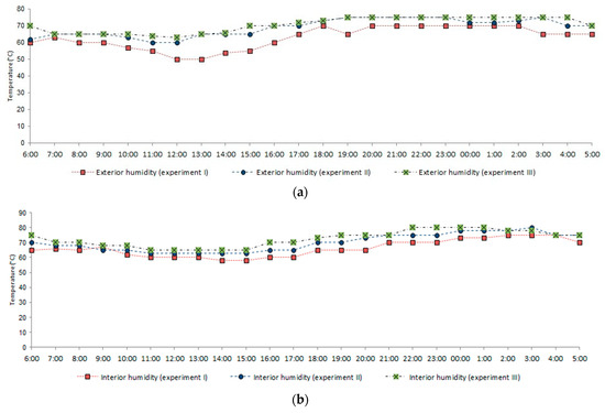 Comparison between: (a) exterior space humidity and (b) interior space humidity of bare wall and green facade.