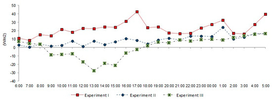 After sunset (6:00 p.m.), due to the absence of solar radiation and no effect of shadow from green facade, both for exterior space temperature of experiment I and II decreased. However, in experiment III, the ambient around green facade still absorbed more heat energy during night (7:00 p.m.–5:00 a.m.) to remove the heat store from the interior space during daytime while trying to achieve a balanced point. The lowest differences of exterior space temperature among the three experiments are from 6:00 a.m. to 8:00 p.m.