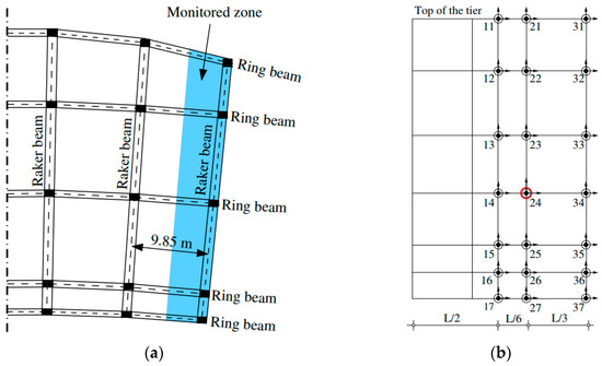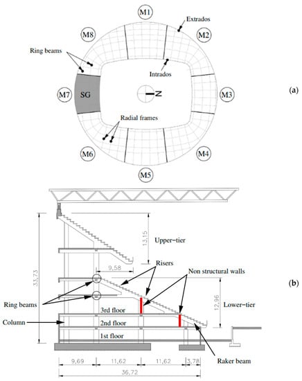 In terms of structural concept, according to the available technical drawings, the stadium is basically divided into eight independent modules, comprising a total of 48 radial frames, see Figure 2a. Each frame consists of RC columns, walls and beams, while post-tensioned RC sections are used for raker beams (0.90 × 0.95 mm2) and ring beams (0.70 × 0.60 mm2). The ring beams have spans ranging between 10.5 m and 12.5 m, while pre-stressed hollow-core slabs with RC topping are used in the floors.