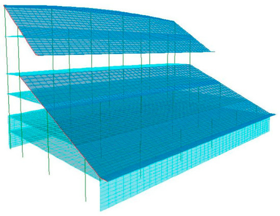 Before the execution of on-site experiments, a preliminary 3D FE model was developed using SAP2000 [25] commercial code, see Figure 5, by accounting for the available technical drawings of the grandstand. Four-node quadrilateral shell elements with six degrees of freedom per node were used to model the RC slabs, the walls and the risers of the grandstand, while the other structural elements (namely the RC columns and beams) were described by means of frame elements.