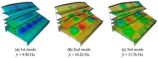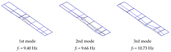 The main functions of the raker beams are to accommodate the riser beams and to transmit their loads to the main structural frame of the grandstand. They also confer an additional horizontal stiffness to the main frame, limiting the inter-story drifts of the overall grandstand. The racker beams are usually pre-stressed, heavy RC elements, cast in place, and hence more prone to geometrical imperfections and deviations from their nominal features. For this reason, the sensitivity analysis was still focused on their elastic modulus E and specific weight γ. The numerical plots presented in Figure 12c,d, however, show that, while E-changes mildly affect the modal properties of the grandstand modes, these modes are mostly non-sensitive to changes in the specific weight γ of the raker beams. Therefore, in the updated FE model, the changes were limited to a +3% increase in the elastic modulus.