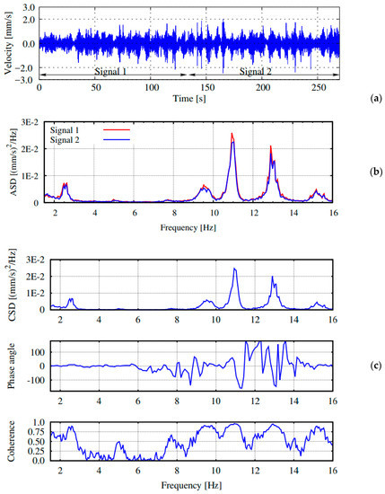 Data relevance was commonly considered reliable when (like in Figure 8a,b), their auto-power spectral density estimates showed relevant peaks at the same frequencies. In Figure 8c, the cross-spectrum, coherency, and phase angles for the two signal segments are also proposed. As shown, the relevant peaks exhibit perfect to near-perfect coherence and consistent phase angles.