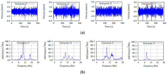 (a) Typical time history and (b) auto-power spectral density for selected representative grid points (vertical direction).