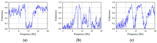 Analysing the time history velocity curves, one can observe that similar velocity amplitude was recorded by all sensors, indicating that the dynamic load was distributed uniformly on the structure. Moreover, the presence of relevant peaks in the same frequency range of the power spectral density plots, strongly suggests that they are consistently related to the natural modes of the structure. In order to evaluate the significance of the spectral peaks in term of the structural vibration modes, the coherence functions for a set of channel pairs are also shown in Figure 10a–c. There, the collected plots suggest a rather good correlation, in the frequency intervals where fundamental modes are expected. Highest values of the coherence occur around 10 Hz, indicating possible frequencies around this value.