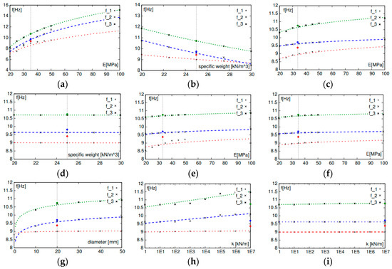 FE sensitivity study of the grandstand. In evidence, the variation of the first three vibration frequencies of the structure. (a–i) plots according to Table 4.