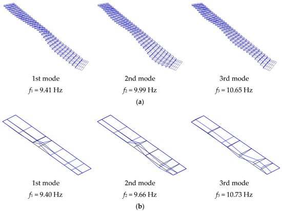 (a) Numerical (updated FE model) and (b) experimental fundamental modal shapes, with evidence of the corresponding vibration frequencies.