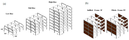 To better explain the new procedure and to illustrate its accuracy and reliability when applied on a broad territorial scale, the proposed approach was employed in the assessment of economic direct seismic losses of widely used RC-MRFs for Italian and European buildings. The building types considered in previous studies [42,43,44] based on their characteristics and based on acquired numerical results are considered perfectly coherent with the proposed approach, and so they are used to better describe the proposed approach. The main features of the types are reported in Figure 2.