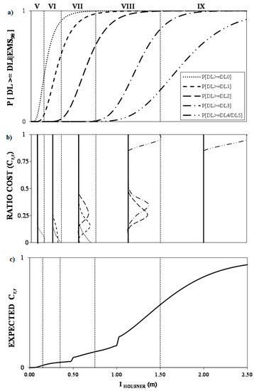 Finally, based on Equation (3), economic direct seismic loss models for each building type considered are proposed. As an example, for one building type, lognormal parameters of FCs and repair cost functions are reported in the Appendix. In particular, the considered type is a reinforced concrete (RC) type with a moment-resistant frame (MRF), designed following the pre-code standard. For this type, Figure 5a illustrates fragility curves according to the damage model while cost ratio functions for damage levels are reported in Figure 5b. Finally, the convolution observed between the FCs and the cost ratio functions are reported in Figure 5c.