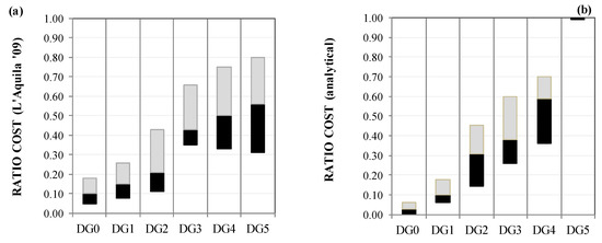 Consequently, differences in component damage distributions lead to relevant differences in repair costs. Based on the differences reported in Figure 3, cost ratio functions must be dependent on seismic intensity levels. Thus, in defining cost ratio functions, for each NLDA, repair costs must be evaluated based on real damage distributions. For this purpose, building damage distributions must be investigated based on components of DCMs.