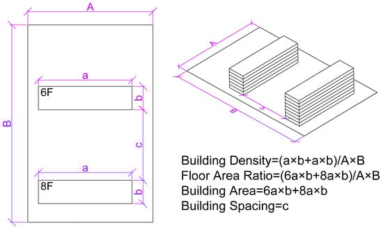 The study mainly analyzes the relationship between floor area ratio, building density, building height and solar radiation quantity in three different residential layout patterns. Floor area ratio is the ratio of a building’s total floor area to the size of the piece of land upon which it is built. It is relevant to the control of settlement density at city overall level. And it is a planning indicator for the intensity of land development. Building density is the ratio of the total basement area of the building to the area occupied by the building within a certain range. It refers to the coverage rate of the building, reflecting the open space rate and building density within a certain land use range. Building height refers to the vertical height of the building, which is one of the technical and economic indicators of the design and is the parameter of urban planning control. These three parameters, floor area ratio, building density and building height, affect each other closely; meanwhile, they are also related to each other. Exploring the relationship between one of the above three planning indicators and the solar radiation quantity, it will have a comprehensive correlation with the change of the other two planning indicators. The detailed explanation has been shown in Figure 1.