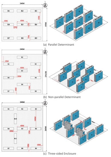 Based on the floor range and typical layout pattern of the above-mentioned high-rise residential areas, the typical residential patterns determined of this study are the parallel determinant (8 Floors–35 Floors), the non-parallel determinant (8 Floors–35 Floors) and the three-sided enclosure (8 Floors–35 Floors).