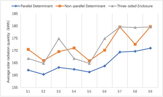 Among the three typical layout patterns, the most south-facing #7, #8, #9 buildings are unobstructed, so the south facades’ radiation level of these three buildings is higher in each respective layout pattern. Among the south facades with the same area, #2 and #5 buildings are affected by the occlusion of the surrounding environment, which are the south facades that receive less solar radiation under the same conditions. In three layout patterns, the south facades that can receive the maximum solar radiation quantity are the same, all of which are S9; while the south facades that can receive the minimum solar radiation quantity are also the same, all of which are S2. The results of the S9 and S2 facade variation are shown in Table 1. Due to the relatively large building spacing distance, the three-sided enclosure type has a larger variation range in the solar radiation quantity among different south facades, followed by the non-parallel determinant and the parallel determinant.