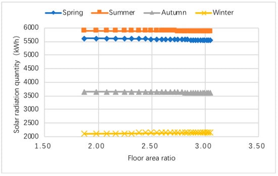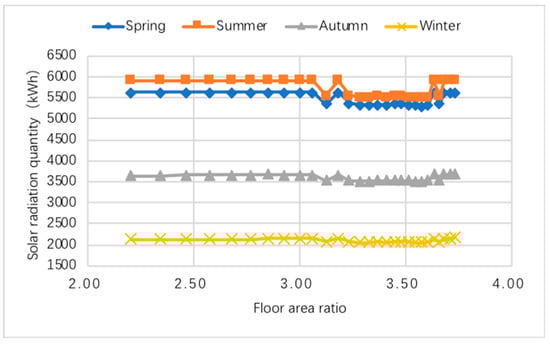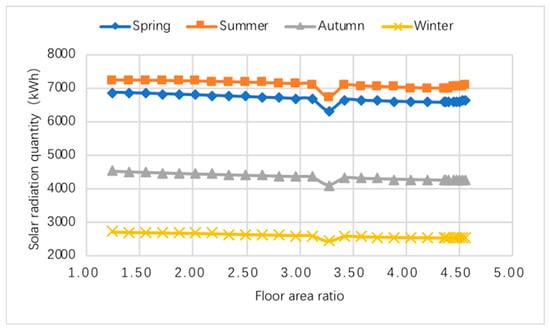 Adding the building roof and south facade solar radiation quantity of spring, summer, autumn and winter together with each different floor area ratios, the quantitative relationship between the radiation quantity and each season is compared. The result is shown in Figure 4. The four seasonal changing trends and the floating range are roughly the same, both of which are high stable, low stable and back to high stable. The floating range in spring and summer is more obvious, while in autumn and winter is weaker.