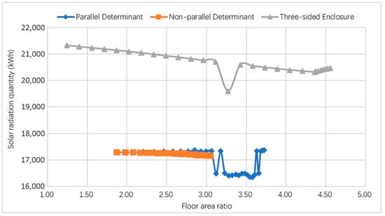 According to the simulation data of the non-parallel determinant, it can be seen that with the increase of the floor area ratio, the solar radiation quantity is gradually reduced with the average decreasing ratio 0.76%. When the floor area ratio is in the range of 1.87–2.67, the solar radiation quantity is gradually decreasing. It is slightly floating in the range of 2.71–2.89 and gradually decreasing in the range of 2.91–3.05.