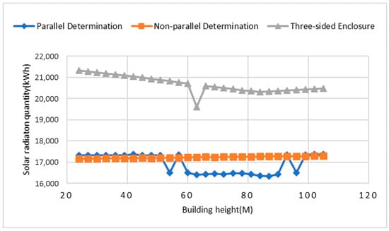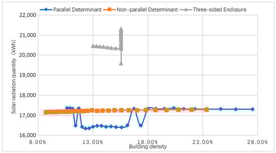 The building density and solar radiation quantity of the three layout patterns are summarized. The result is shown in Figure 8. When the building density is in the range of 11.43–17.34%, the solar radiation quantity is unstable. At the same time, the non-parallel determinant solar radiation quantity is larger than the parallel determinant of this range of building density. In addition to the above building density, the parallel determinant of solar radiation quantity is larger than the non-parallel determinant. Since the residential building has a width of 60 m, the two residential buildings #10 and #11 are laid out in the north-south building space, resulting in the three-sided enclosure under 8F~28F layout modes with the same spacing distance of 100 m between the middle row buildings and the side row buildings. The basement area of building under 8F–28F layout modes is the same, as well as the plot area; thus, the building density is all 15.57% under 8F–28F layout mode of three-sided enclosure. With the increase of the building height, the mutual occlusion effect among buildings is obviously, so the solar radiation quantity of 8F–28F residential area shows a decreasing trend. The three-sided enclosure has two more roofs and two more gables solar radiation quantity than the parallel determinant and the non-parallel determinant but the average solar radiation quantity of the three-sided enclosure is about 1.2 times the amount of other two determinant patterns.