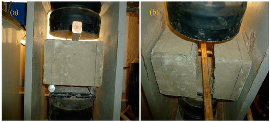 Some of the tests used in the evaluation and strength performance of natural fiber reinforced polymer mortars are compressive, flexural and tensile strength tests [25]. Therefore, 150 mm cubes were cast for compressive strength, cylinder sizes of 150 × 350 mm for splitting tensile strength and beams of sizes 100 × 100 × 400 mm for flexural strength. 28, 45 and 60 days of air curing were carried out for all the specimens for the three tests conducted at laboratory temperature of 25 °C. The compressive strength test was performed in accordance with the BS 1881 standard. using a universal crushing machine with a 2000 kN capacity, the splitting tests were conducted in accordance with ASTM [26] and a loading rate of 1.2 MPa/min was applied without shock until failure occurred, as seen in Figure 2. The flexural strength tests were conducted according to BS [27] using beams with a center point loading arrangement and loading was applied without shock.