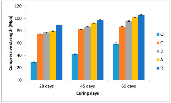 Compressive strength result (Legend: CT = control, C = 10% latex, D = 0.5% fiber and 10% latex, A = 1% fiber and 10% latex and R = 1.5% fiber and 10% latex.)