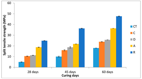 Split tensile strength result. (Legend: CT = control, C = 10% latex, D = 0.5% fiber and 10% latex, A = 1% fiber and 10% latex and R = 1.5% fiber and 10% latex.)