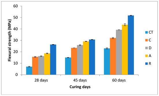Flexural strength result. Legend: CT = control, C = 10% latex, D = 0.5% fiber and 10% latex, A = 1% fiber and 10% latex and R = 1.5% fiber and 10% latex.
