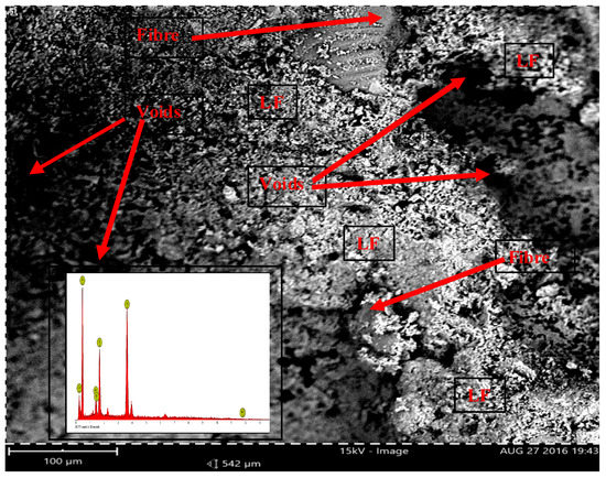 The scanning electron microscope (SEM) obtained for the bamboo reinforced acrylic polymer cement composite in Figure 6 and Figure 7 showed agglomerated acrylic emulsion latex precipitated in the hollows and on the surface of the bamboo fibers. The micrograph showed gels of calcium silicate hydrates (C–S–H), and unhydrated Portland cement clinker grain. Due to their size and very low interconnectivity, these pores are relatively impermeable to water, which is in agreement with the physical properties conducted on the samples. Capillary voids (voids created by water particle movements and space not occupied by solid components) are also seen in the image obtained in Figure 6, these also are major contributors to the porosity of the composite mortar. The size of capillary voids is much larger at the interfacial zone, which is the region at the interface of the aggregate and the hydrated cement paste compared to the bulk cement paste. When the fiber and the matrix combine, organic composition and hydration products in the matrix diffuse each other. These cause the solid and dense materials formed in this layer, and lead to improved mechanical properties when compared with the control samples without neither fiber nor polymer inclusion, as seen in Figure 6. It was clearly observed that the formation of polymer clusters or latex films deposited in the interface layer between the fibers and cement matrix, and the hydrated products of cement also appear in this layer. The presence of these materials together leads to a formation of a network structure as a result of the reaction between the hydrated products and the polymeric materials, as shown in Figure 7. The interconnectivity between these materials is accompanied by an improvement in the mechanical properties of these composites which is more than that of the control samples. These qualities coupled with enhanced bond strength give birth to a composite material of higher strength and lower ductility [39]. When the fibers and matrix are combined, acrylic polymer emulsion forms the interface and the hydration products of the matrix diffuse reciprocally, therefore the density of this area is relatively high.