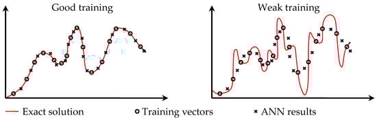The training problem exemplified in Figure 4 is much more important when the whole region of possible solutions is not well covered by the training vectors, because there are many possible solutions that fit those points. In spite of the evidence that an appropriated training of the ANN can lead to better results than some traditional approaches for seismic assessment of large number of buildings [], even when considering a relatively small number of training vectors, it is important to understand how feasible the use of an ANN for practical problems with different number of training vectors is.